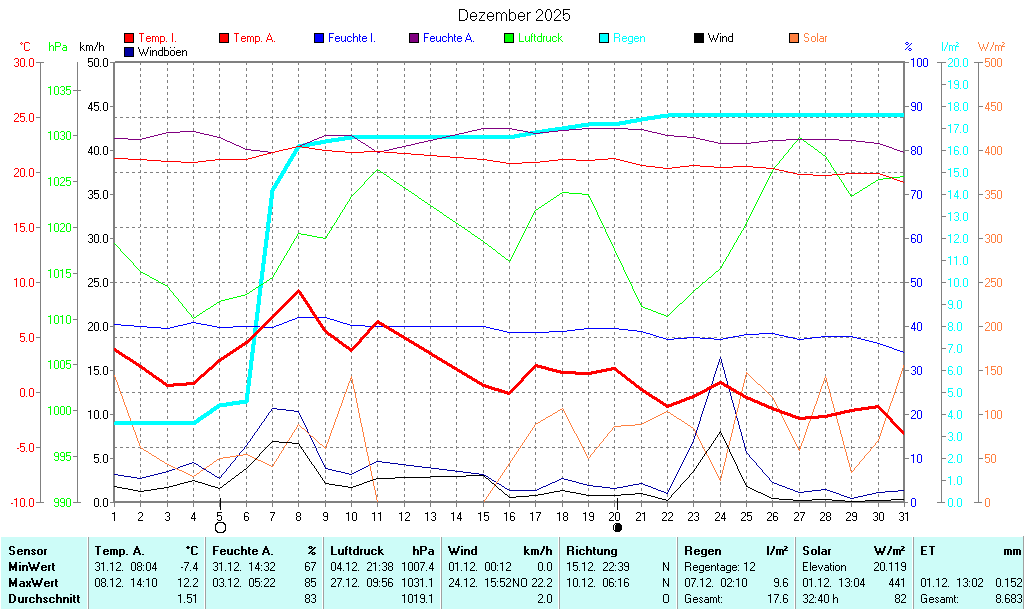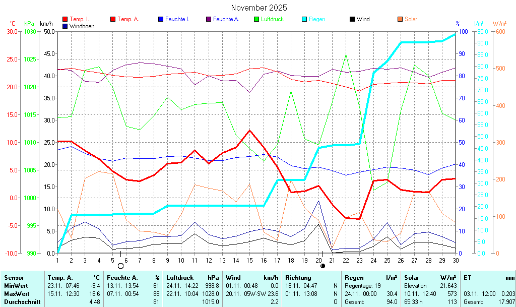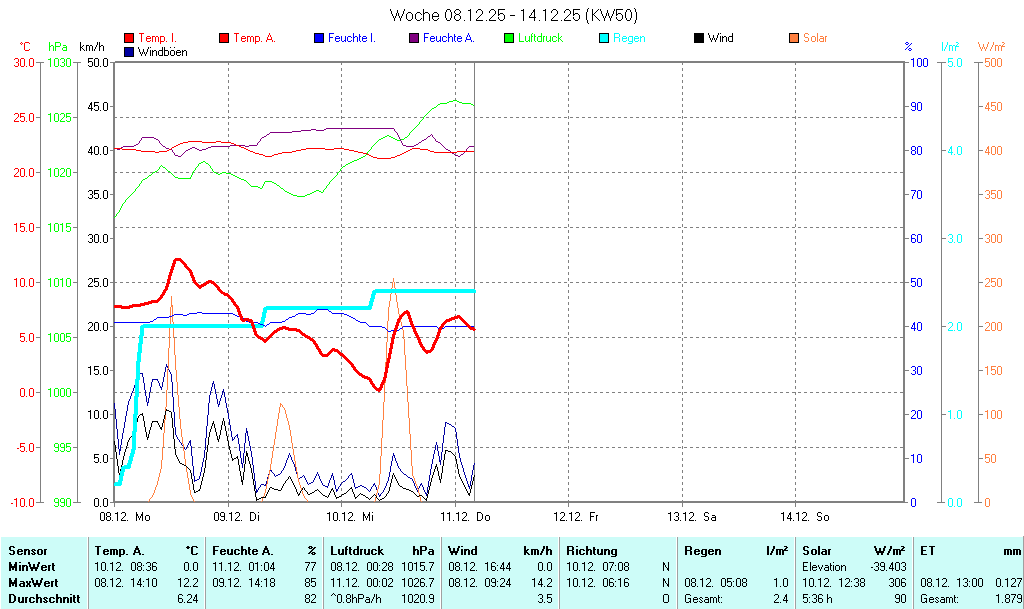 | Die dargestellten Werte repräsentieren die Daten der letzten 24 Stunden! Der Luftdruck ist auf Meereshöhe bezogen! |