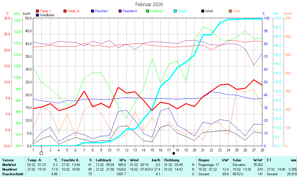 | Die dargestellten Werte repräsentieren die Daten der letzten 24 Stunden! Der Luftdruck ist auf Meereshöhe bezogen! |